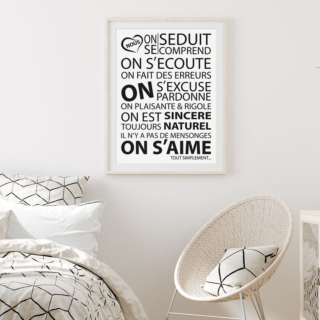 Vous recherchez une affiche originale sur le thème de l'amour, du couple ? Vous venez de trouver ! Décorez votre pièce avec cette affiche décorative "On se séduit" au texte plein d'amour et de tendresse.