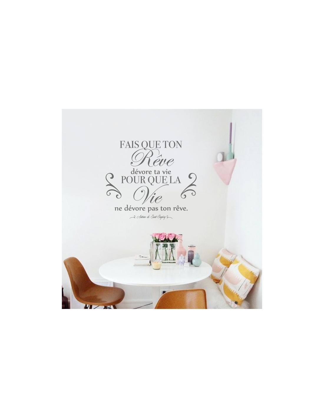 Une citation originale signée Antoine de Saint-Exupéry : "Fais que ton rêve dévore ta vie pour que la vie ne dévore pas ton rêve". Un sticker mural qui donnera sans aucun doute une très jolie touche décorative dans votre intérieur quel que soit la pièce de la maison. Ce sticker citation saura vous rappeler au quotidien à quel point il est important d'avoir des rêves et d'y croire.