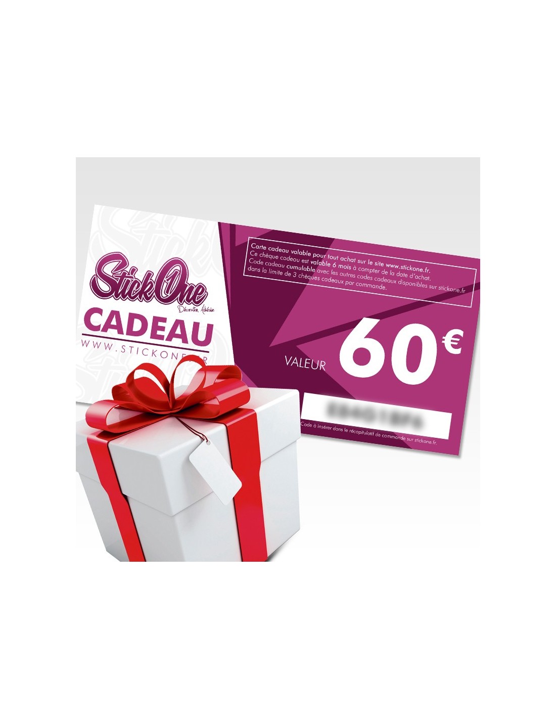Carte cadeau d'une valeur de 60 euros valable pour tout achat sur le site stickone.fr. Chèque cadeau valable 6 mois à compter de la date de la commande de celui-ci.