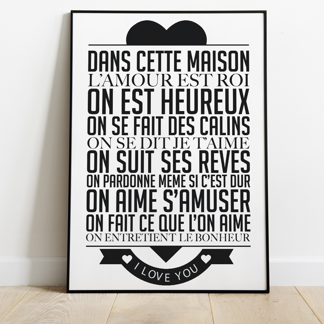 Affichez un peu d'amour dans votre intérieur grâce à cette affiche décorative "Dans notre maison" au texte plein d'amour. Une jolie façon de créer une décoration mural originale et élégante.