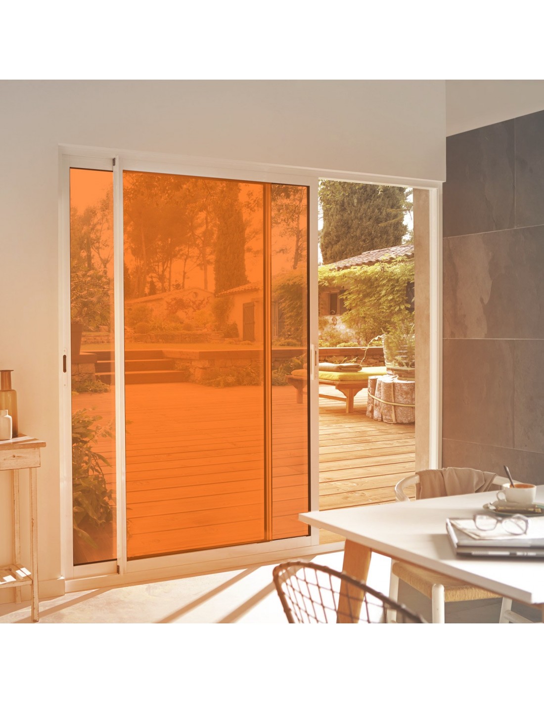Film adhésif de couleur orange ultra transparent pour pose sur surface vitrée : fenêtre, baie, cloison, vitre... Un film décoratif de qualité professionnelle offrant une luminosité coloré grâce à son aspect ultra translucide laissant passer la lumière.