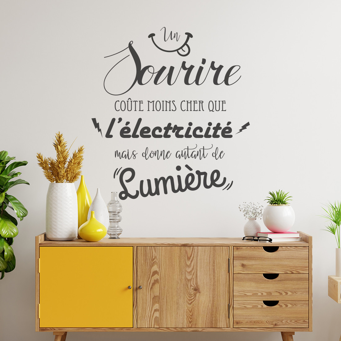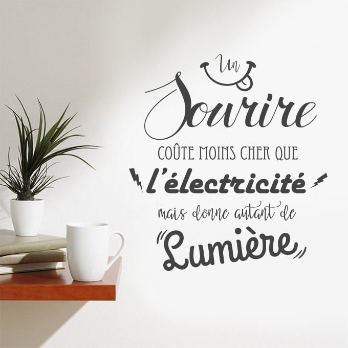 Affichez le sourire à tous ceux et celles qui passerons devant... Ce sticker mural citation positive apportera à votre intérieur un message rappelant qu'un sourire ne coûte rien. Une citation originale : "Un sourire coûte moins chez que l'électricité mais donne autant de lumière", pour décorer l'intérieur de la maison de façon simple et originale.
