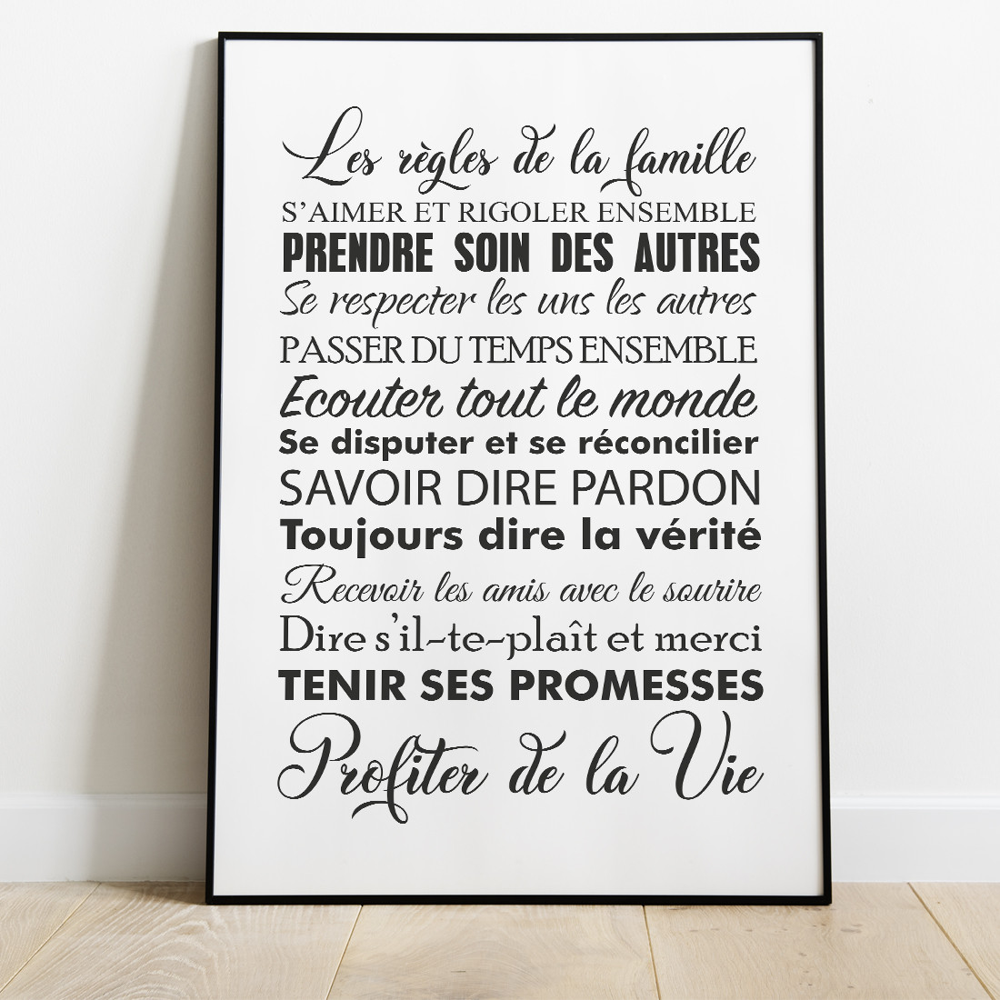 Optez pour l'originalité avec cette affiche les règles de la famille. Un élégant poster qui saura rappeler quotidiennement aux personnes qui vivent sous votre toit les règles de bonne conduite à adopter pour vivre en harmonie tout en profitant de la vie.