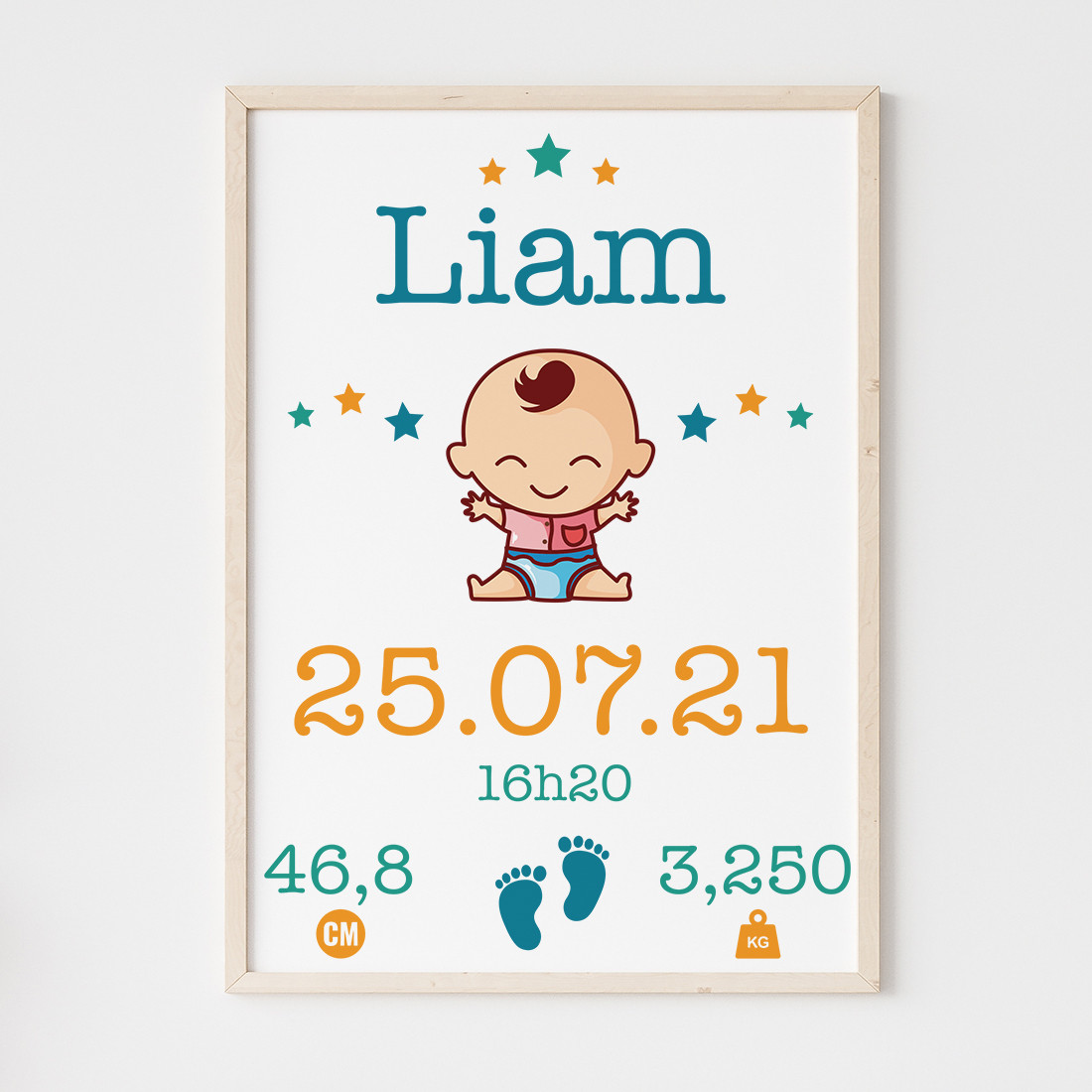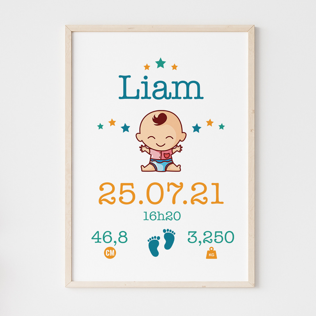 Idéal pour un cadeau de naissance de garçon, cette belle affiche à encadrer ou non, saura faire plaisir. Une petite attention simple qui permettra aux heureux parents d'afficher le prénom, la dates et l'heure de naissance ainsi que le poids et la taille.