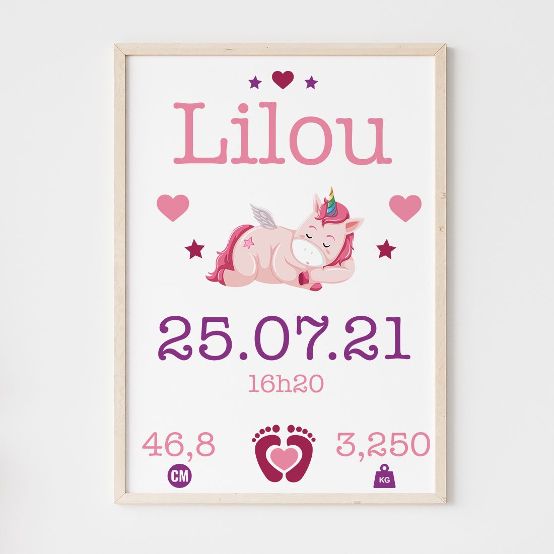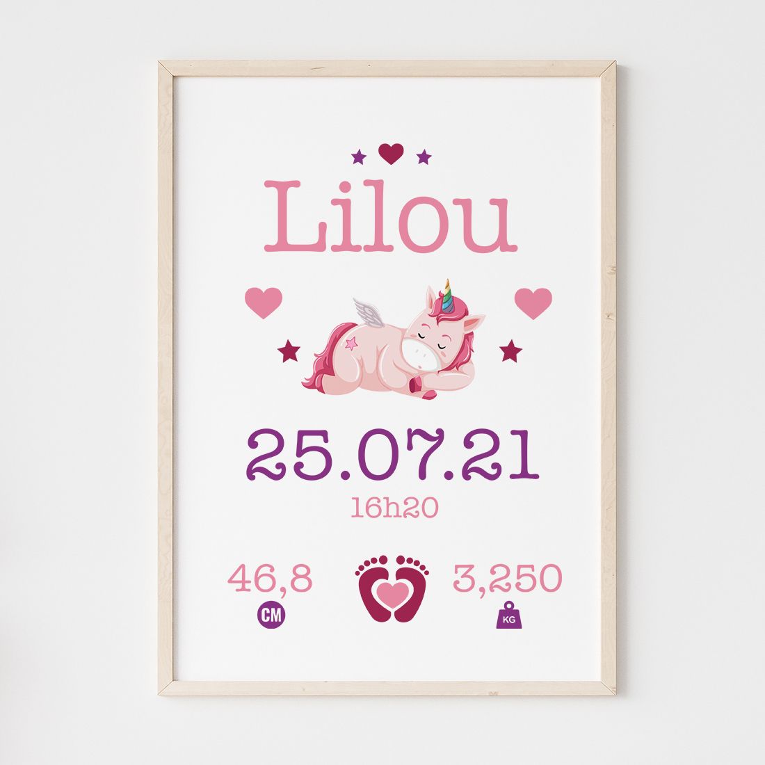 Idéal pour un cadeau de naissance, cette jolie affiche à encadrer saura faire plaisir. Une petite attention simple qui permettra aux heureux parents d'afficher le prénom ainsi que la dates et l'heure de naissance ainsi que le poids et la taille.