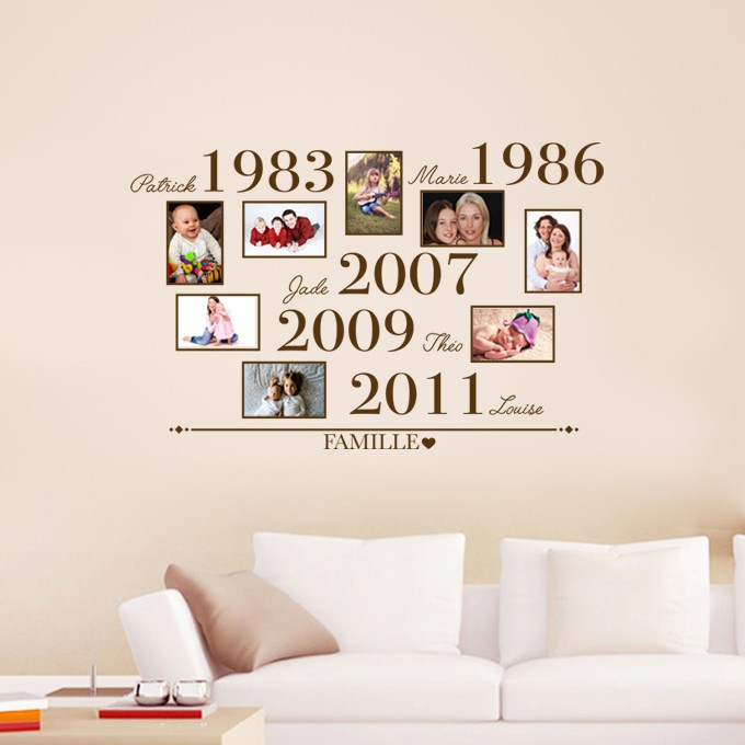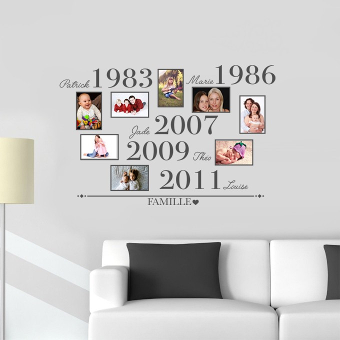 Sticker de décoration murale avec 8 emplacements pour photos au format 10x15cm et personnalisé avec dates de naissances et prénoms des membres de la famille.