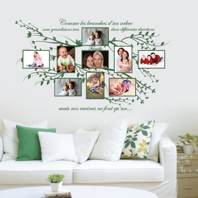 Sticker de décoration murale cadres photos citation sur le thème de la famille composé de 9 emplacements cadres photos au format 10x15cm (3 photos format portrait + 4 photos format paysage)