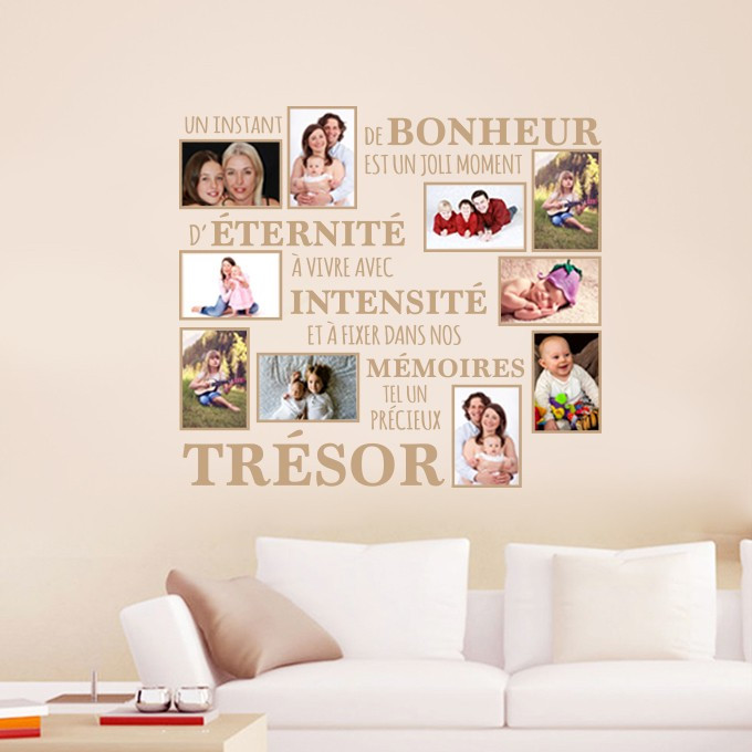 Véritable support de fond pour affichez vos plus belles photos de famille, souvenir etc., ce sticker cadres photos mettra en valeur vos photos avec ses 10 emplacements au format 10x15cm A6 accompagné de la citation : "un instant de bonheur est un joli moment d'éternité à vivre avec intensité...".