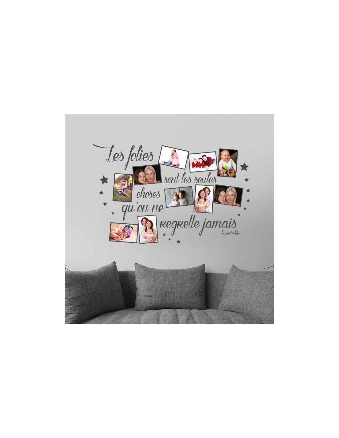 Parce que les folies sont les seules choses que l'on ne regrette jamais, affichez vos meilleurs moments avec ce sticker cadres photos accompagné de la citation signée Oscar Wilde. Composé de 10 emplacements pour recevoir vos photos au format 10x15cm A6 il fera sans aucun doute sensation dans votre intérieur.