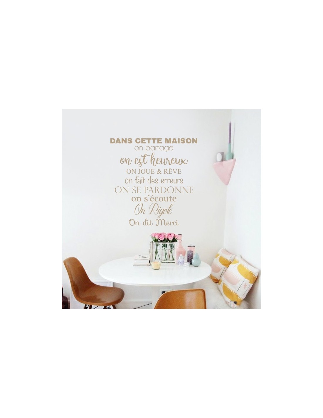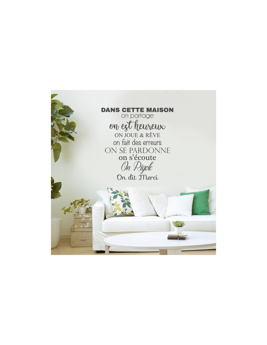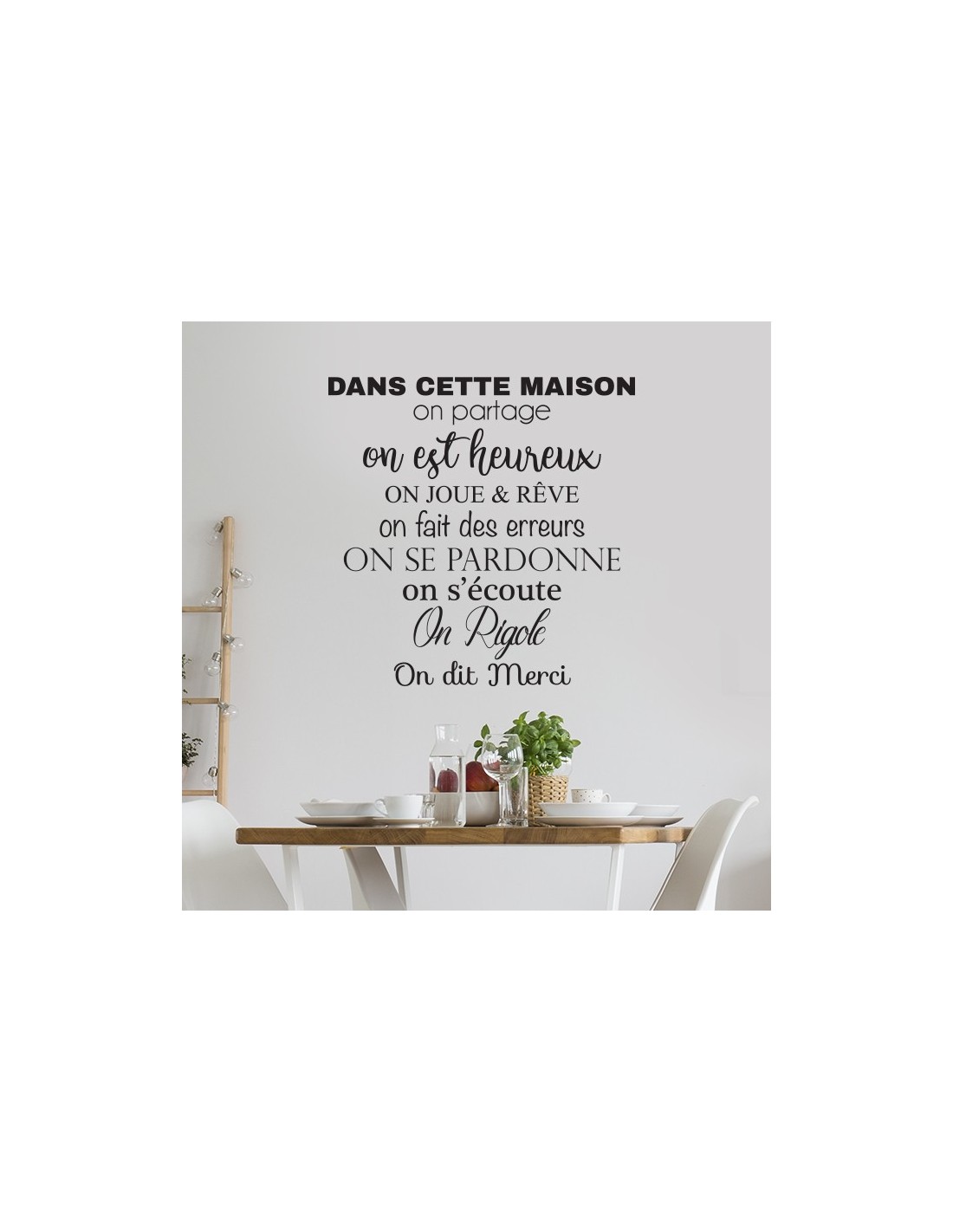 Sticker citation dans cette maison. Quelques règles de bonne conduite à appliquer au quotidien. Une façon simple et originale de décorer son intérieur avec ce sticker texte qui saura très facilement trouver sa place dans une des pièces de votre maison.