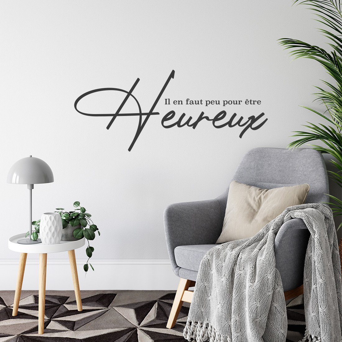 Il en faut peu pour être heureux... Ce sticker citation apportera de la motivation et une touche d'optimisme dans votre intérieur en toute simplicité. Une manière simple et originale d'apporter une petite touche déco de plus à votre intérieur tout en faisant passer un message positif.