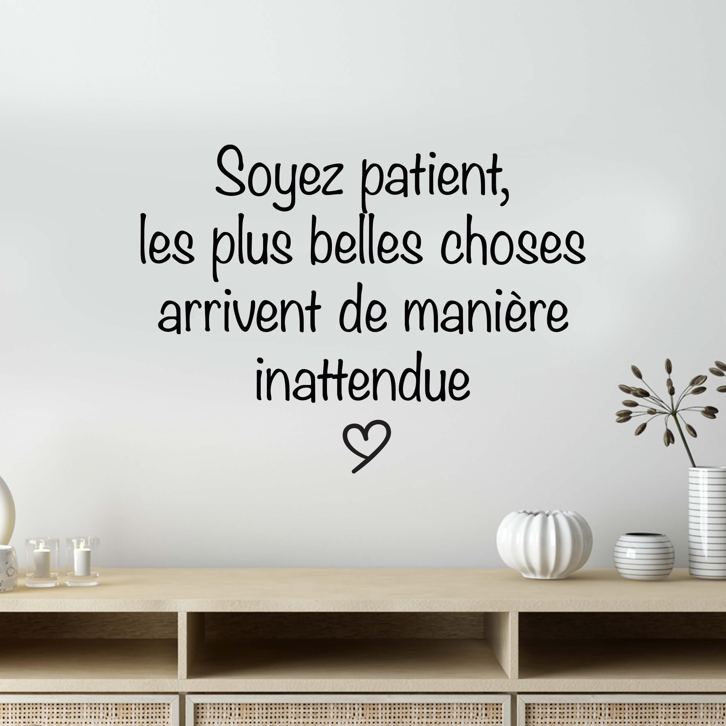 Sticker citation pour créer une belle et douce décoration murale dans votre intérieur. Vous trouverez forcement une petite place pour cette jolie citation : "Soyez patient, les plus belles choses arrivent de manière inattendue".