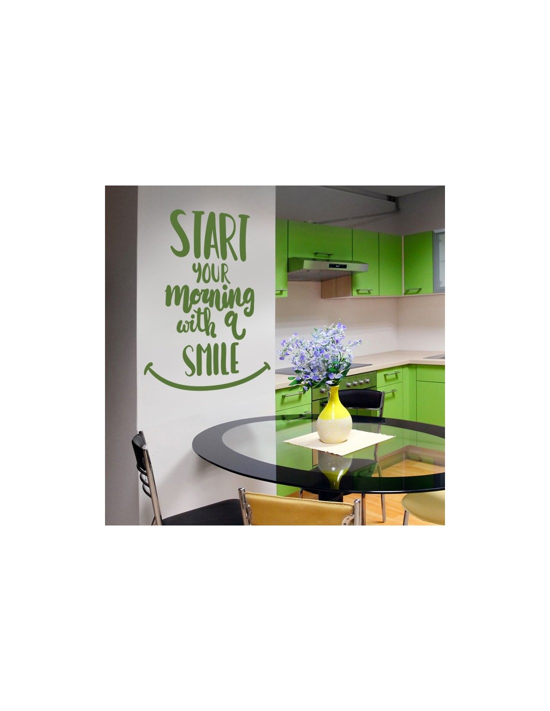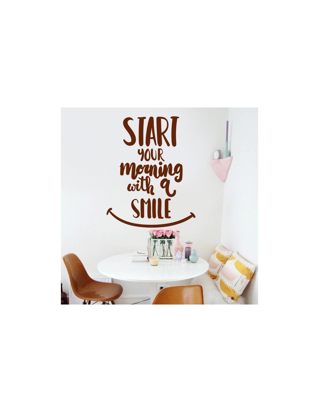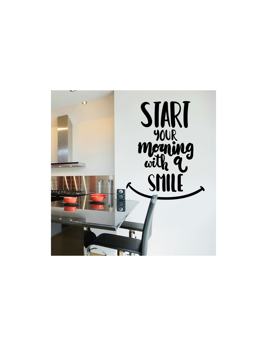 Sticker citation originale en anglais : "Start Your morning With a Smile" (Commence ta journée avec le sourire)