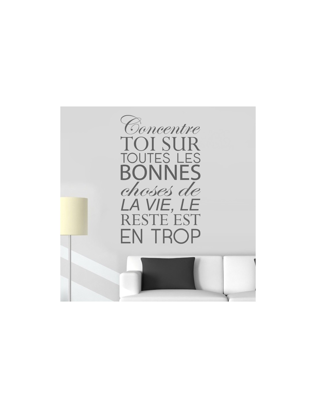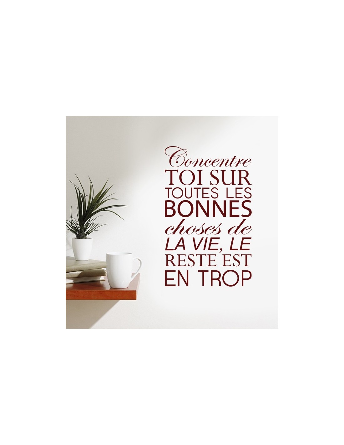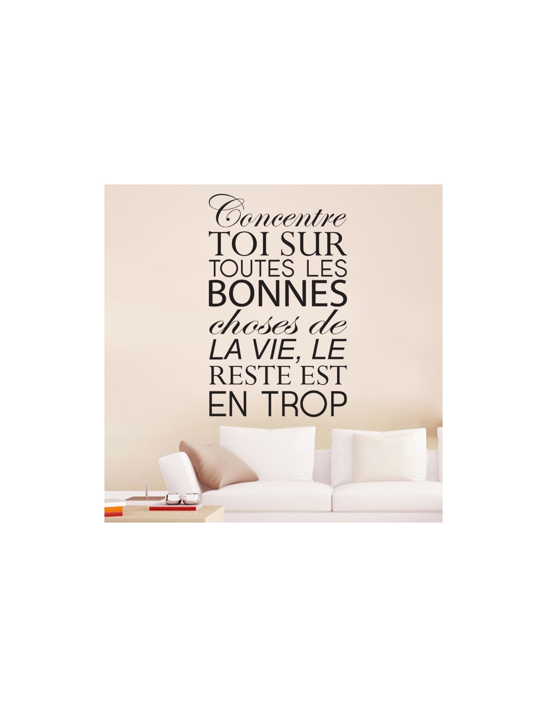 Sticker texte motivation pour parfaire votre décoration d'intérieur avec originalité et en toute simplicité. Ce sticker au texte motivant vous verra voir la vie du bon côté : "Concentre toi sur toutes les bonnes choses de la vie, le reste est en trop."