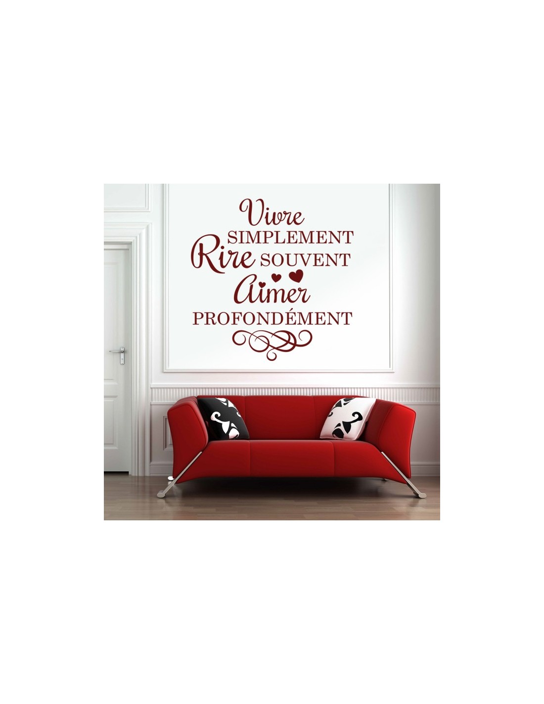 Sticker citation Vivre simplement, rire souvent, aimer profondément pour une belle et douce décoration dans votre intérieur. Quel que soit la pièce, ce sticker prendra sa place sans grand mal dans votre maison pour apporter amour, sérénité et joie de vivre.