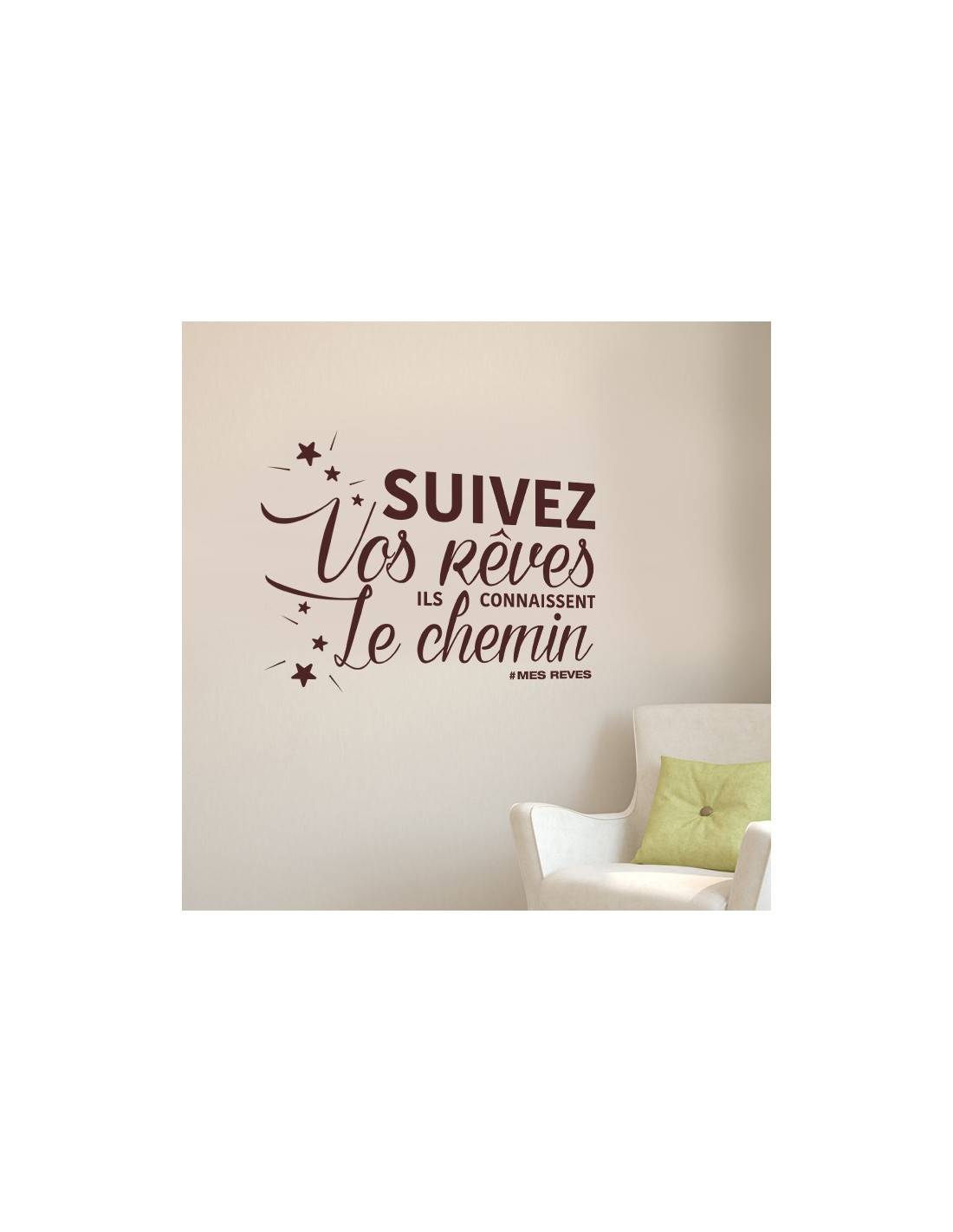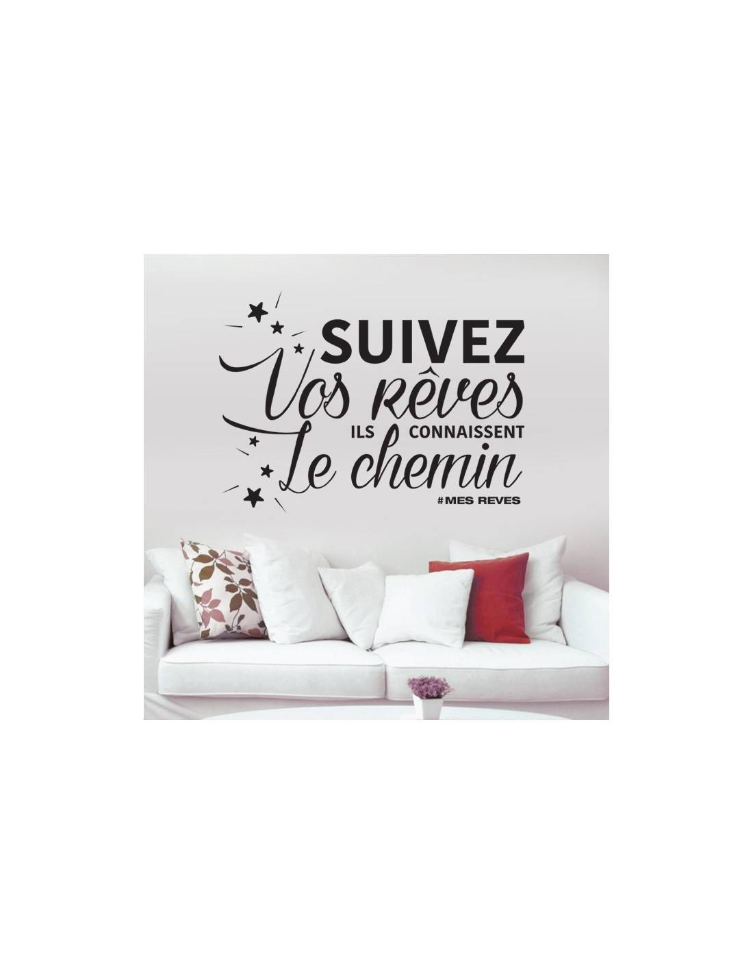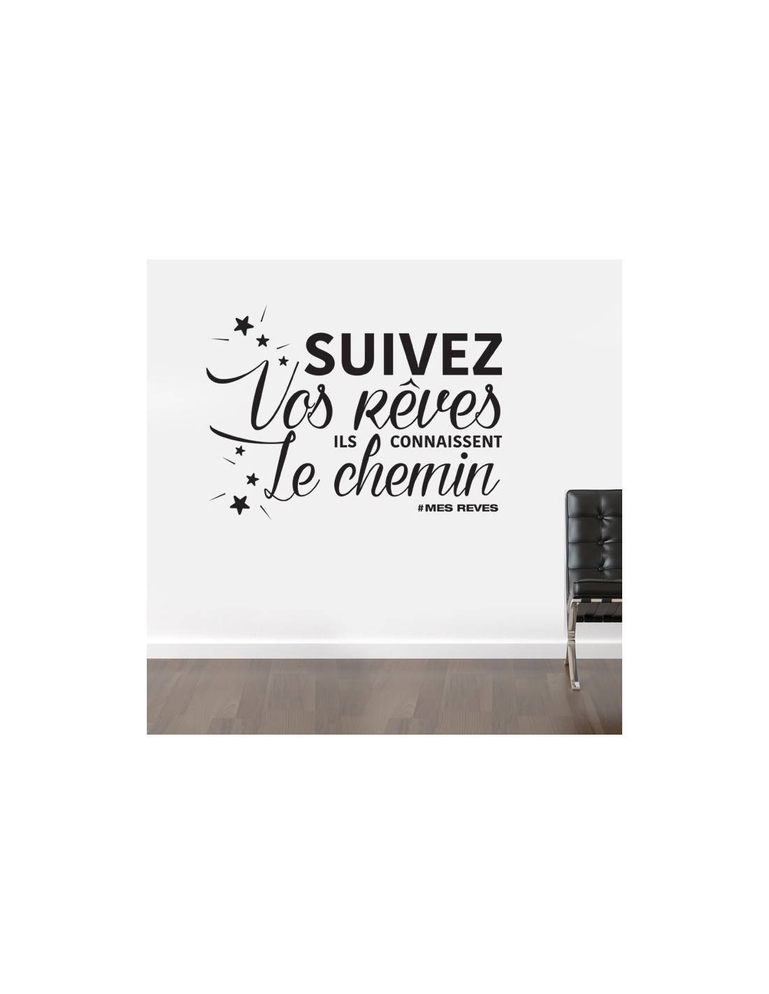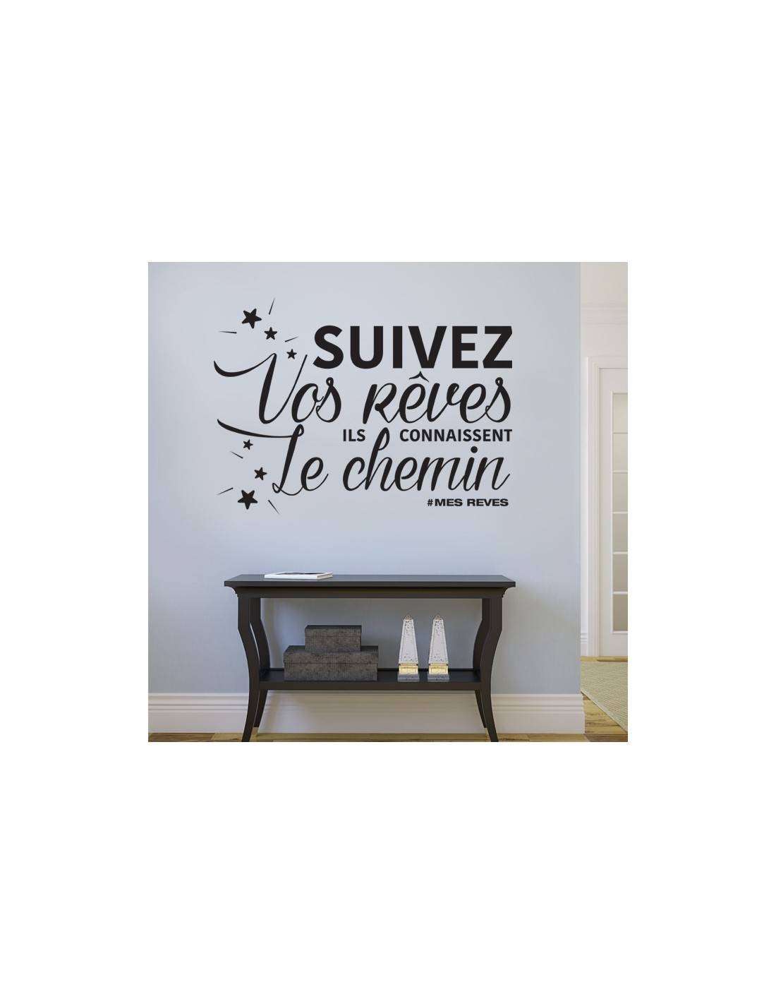 Un sticker mural citation pour votre décoration d'intérieur au message motivant : "Suivez vos rêves, ils connaissent le chemin". Cette décoration murale trouvera très facilement sa place dans votre intérieur et lui apportera une touche de mindset.