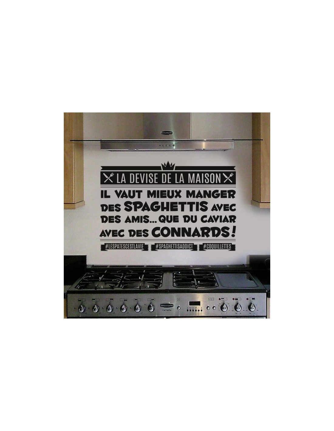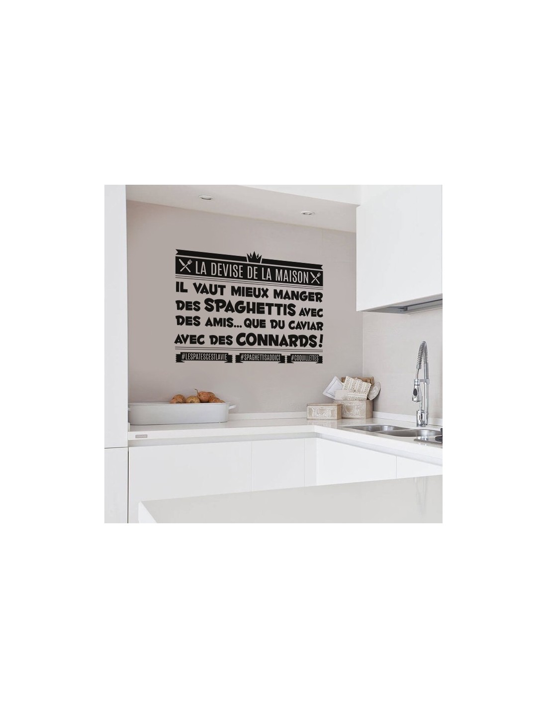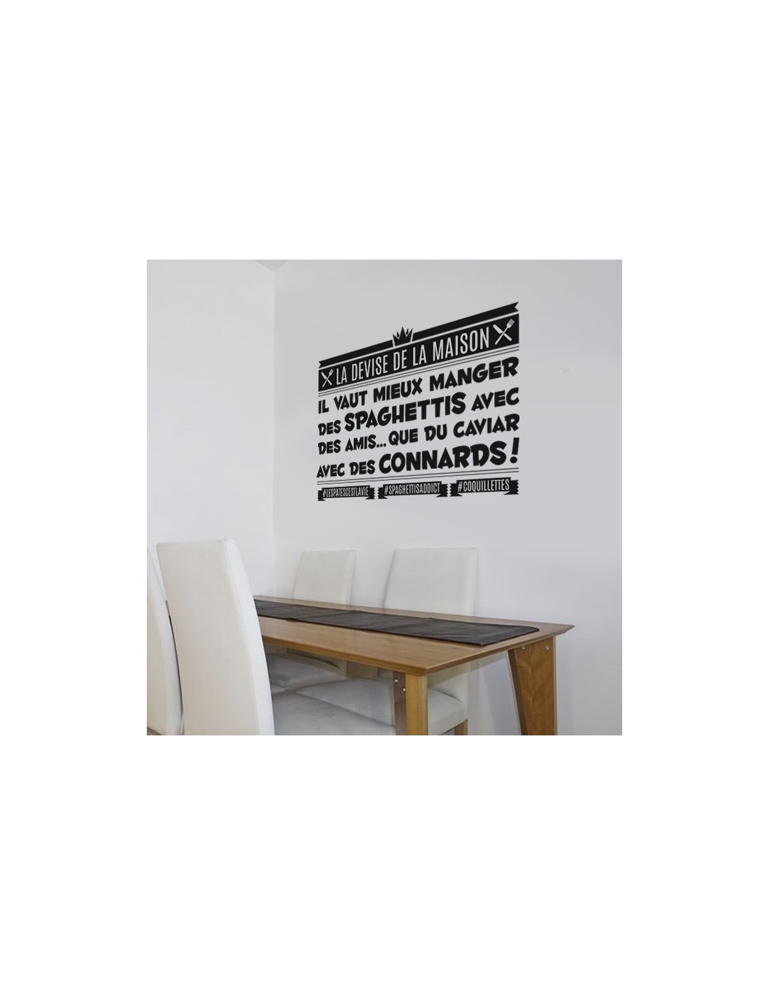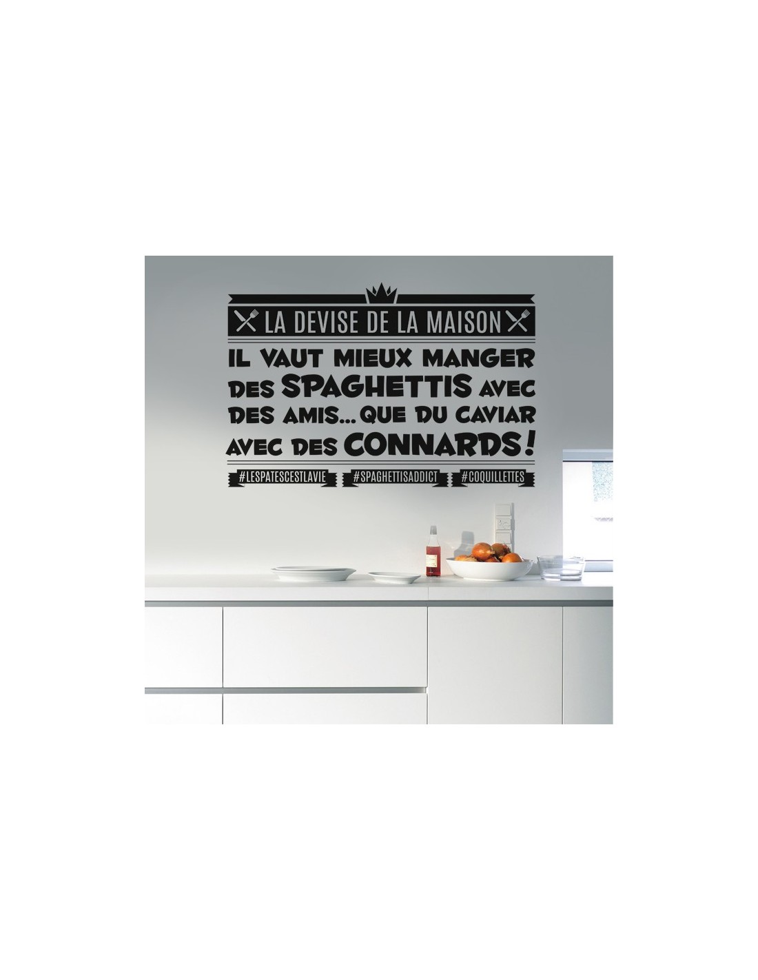 Stickers citation humour pour décoration murale sur le thème de la cuisine : "Mieux vaut manger des spaghettis avec des amis que du caviar avec des connards"