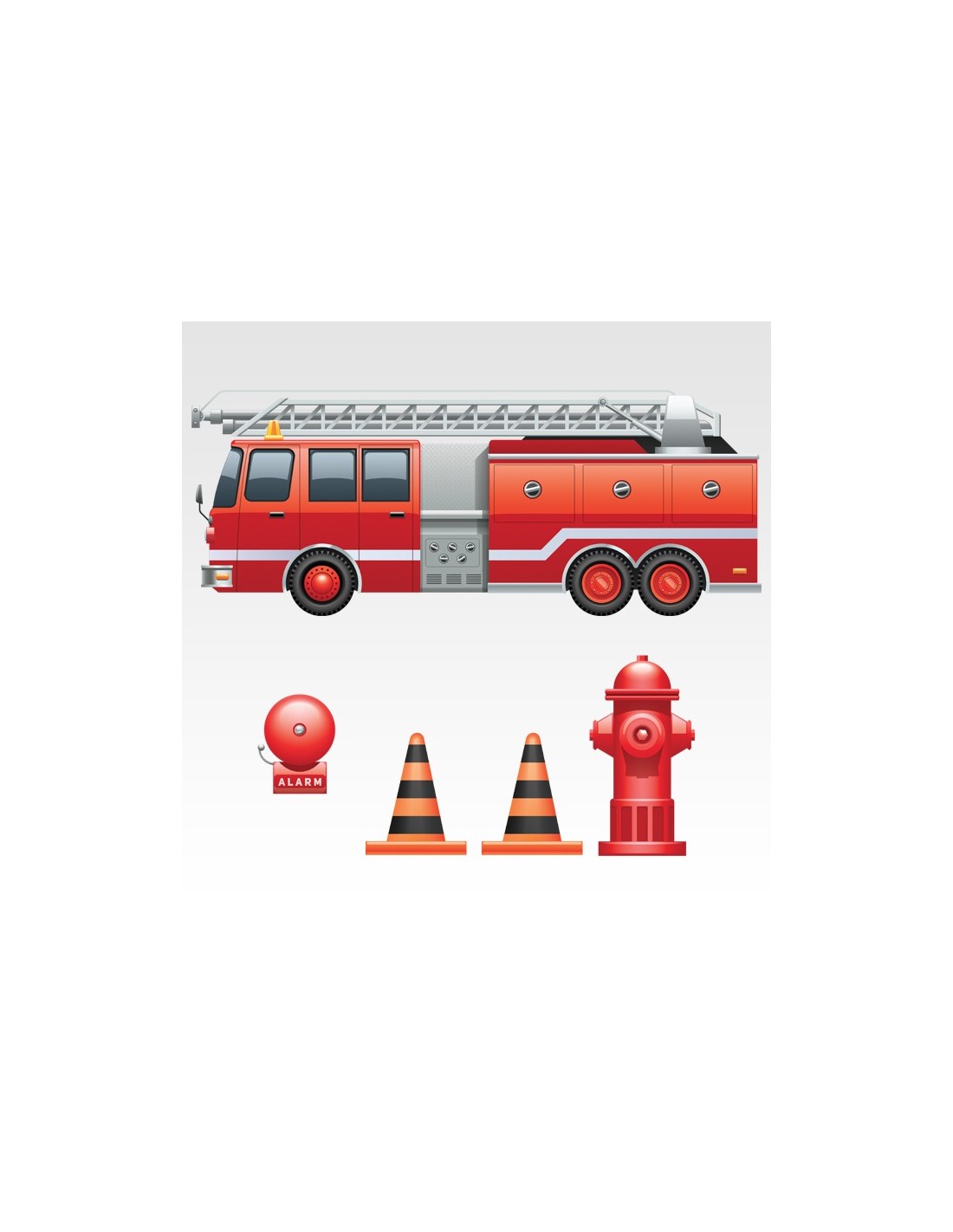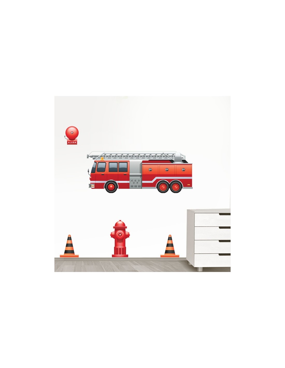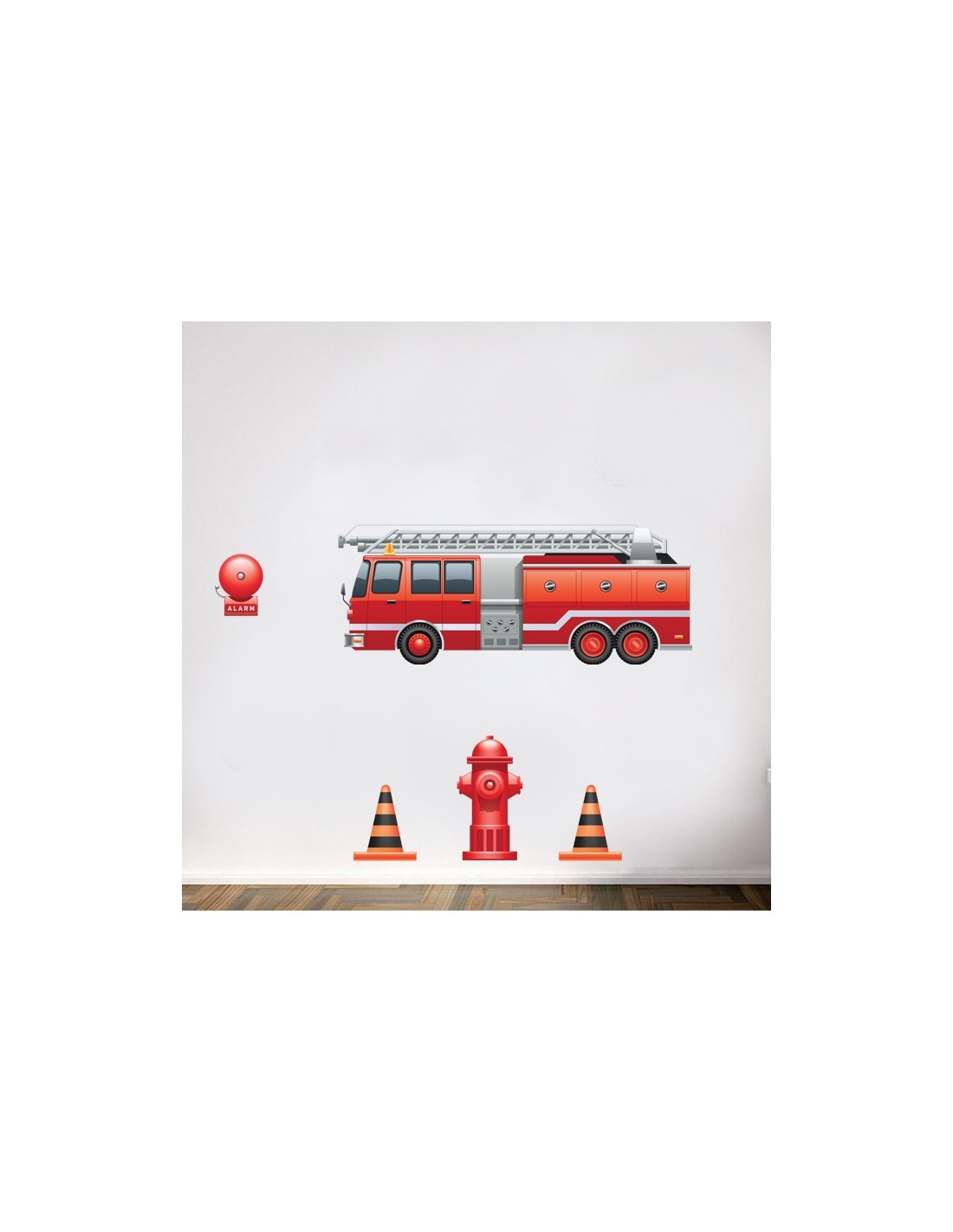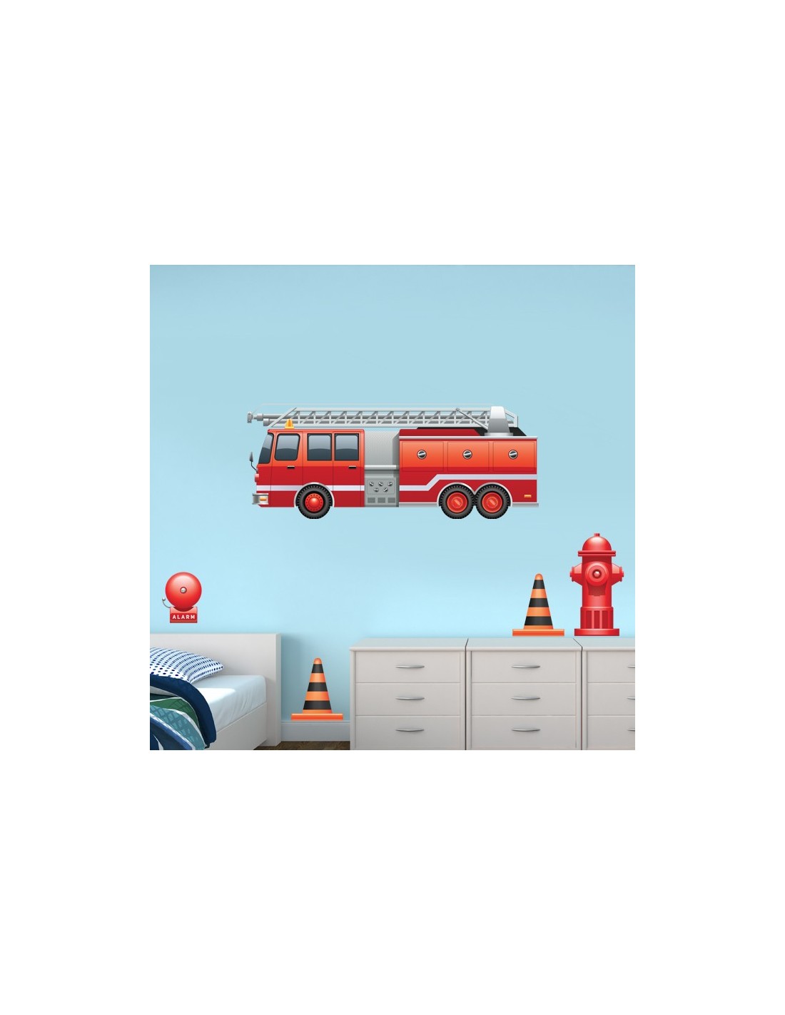 Kit de stickers autocollant pompier composé d'un camion de pompier, une bouche d'incendie, une alarme et de deux plots de sécurité. Le kit autocollant adhésif idéal pour créer une belle décoration de chambre d'enfant sur le thème des sapeurs pompiers.