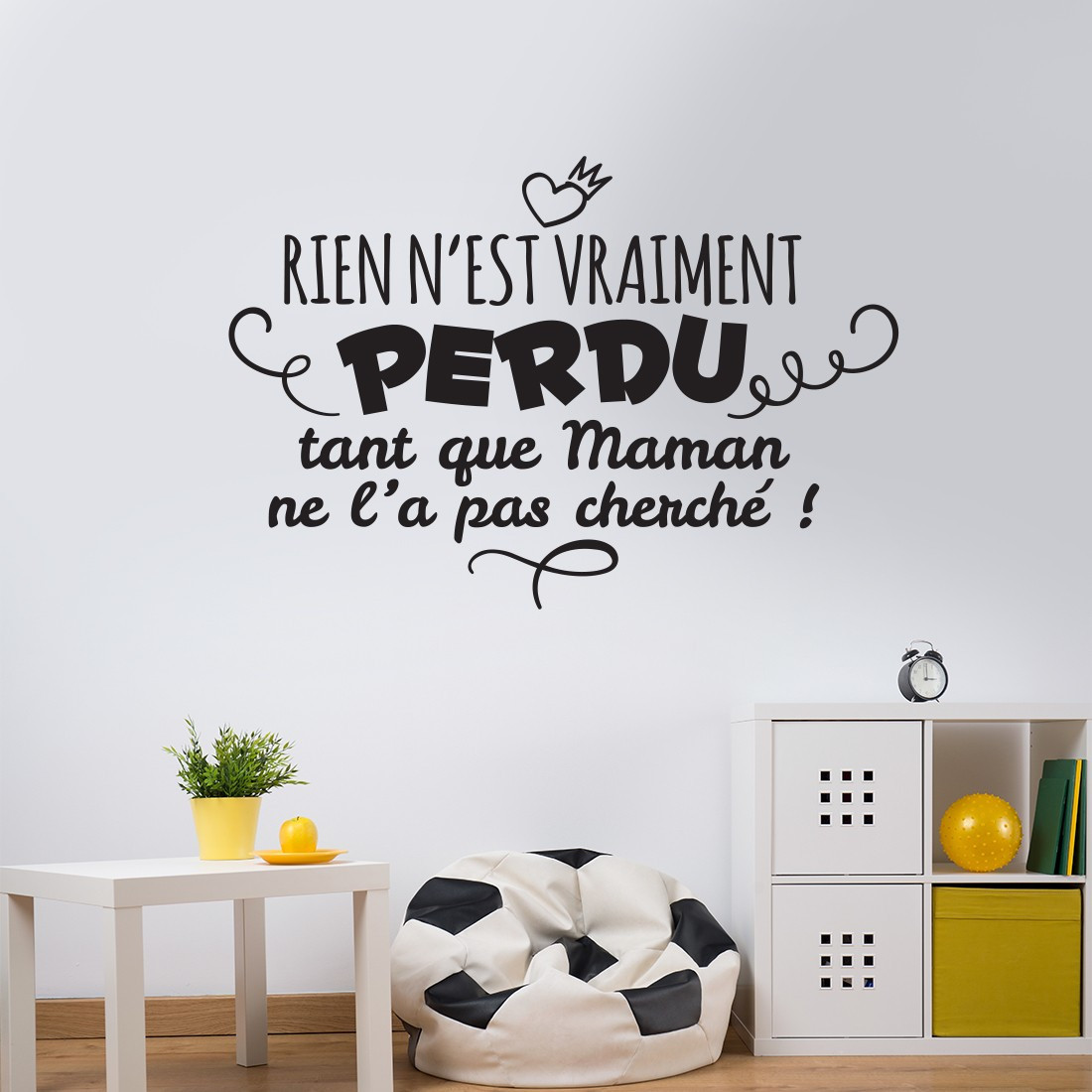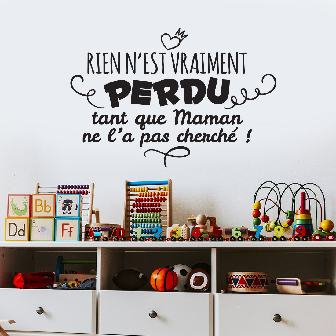 Sticker mural texte pour enfant. Une citation originale et pleine de sens pour nos chers enfants : "Rien n'est perdu tant que maman ne l'a pas cherché !".