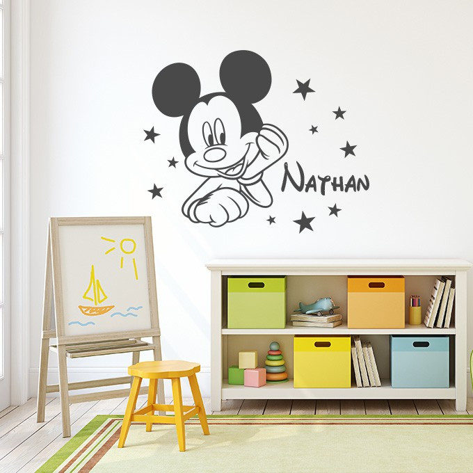 Sticker de décoration murale pour chambre d'enfant avec Mickey et prénom personnalisé arboré d'étoiles magiques pour donner à l'ambiance de la chambre un côté féérique et originale.