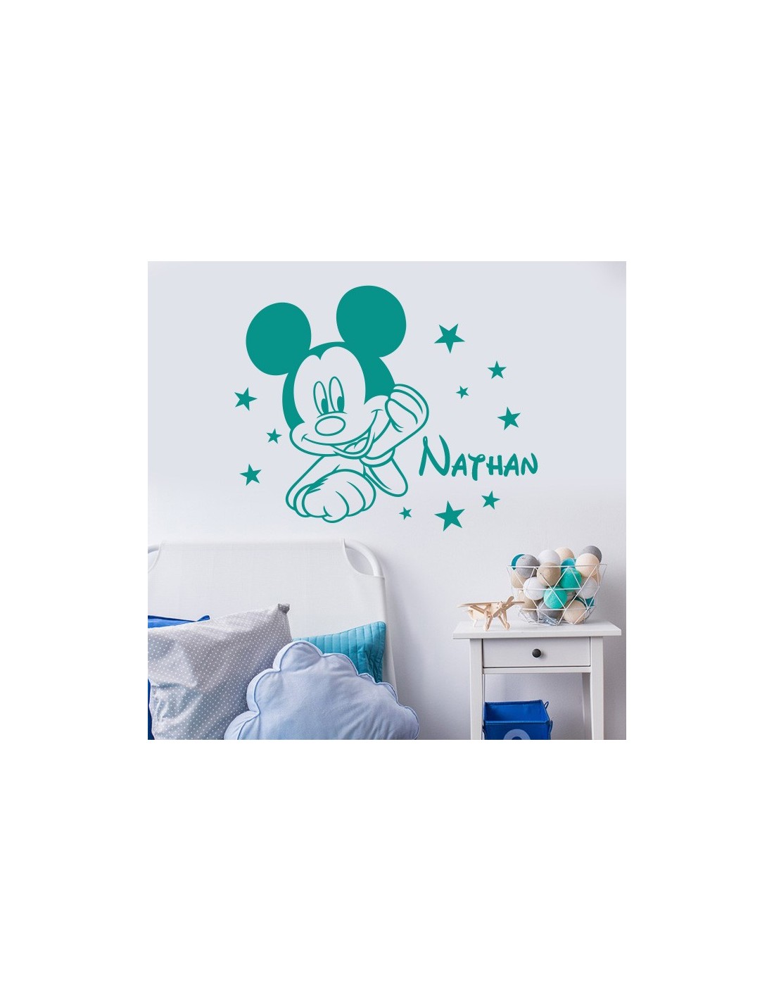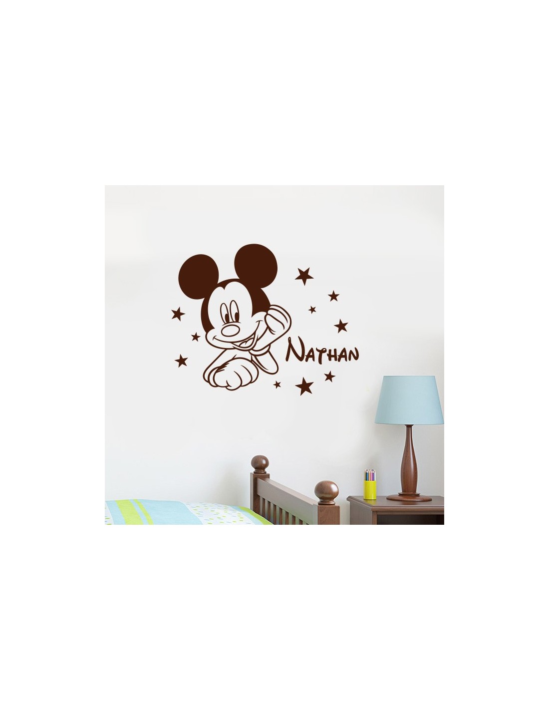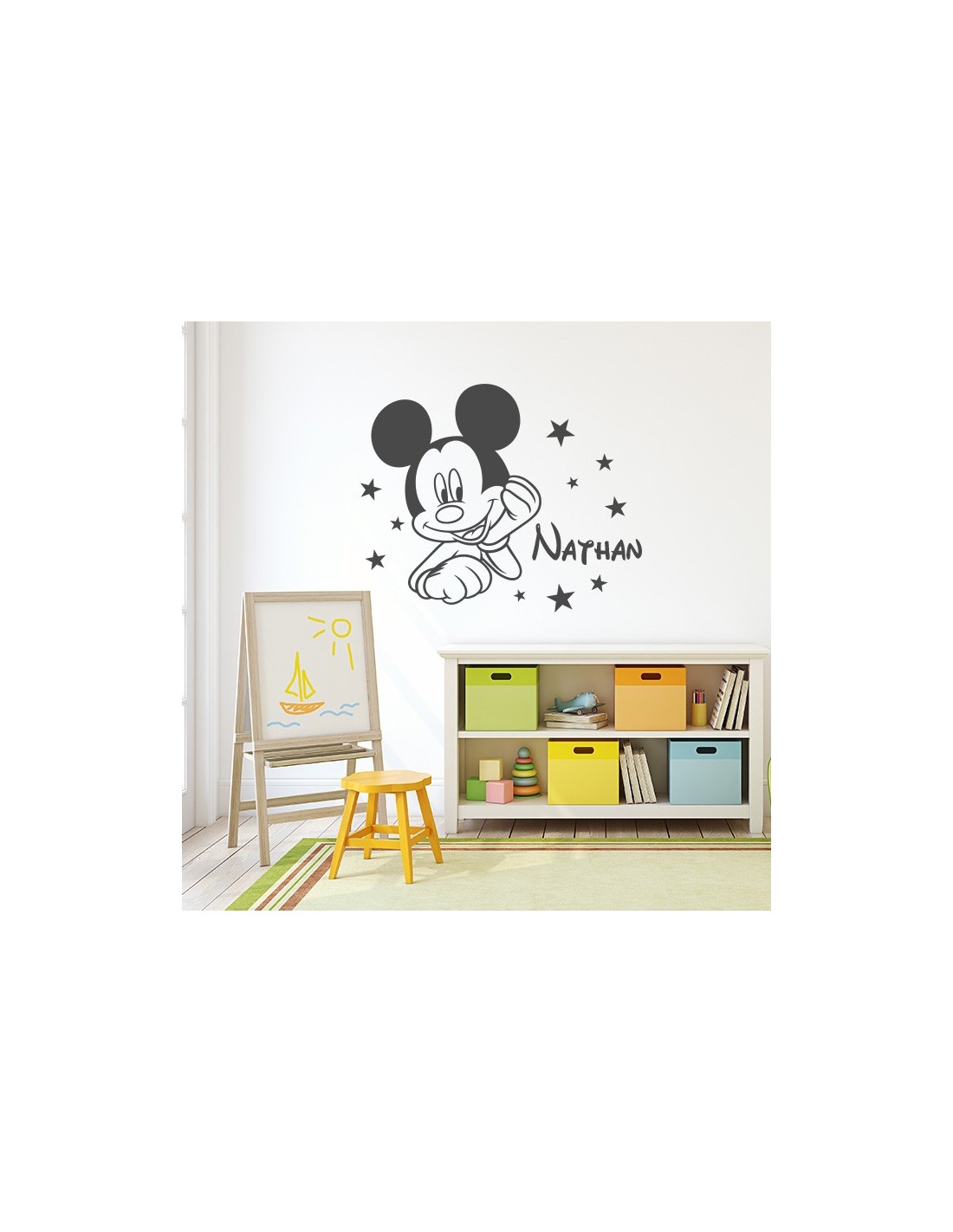 Sticker de décoration murale pour chambre d'enfant avec Mickey et prénom personnalisé arboré d'étoiles magiques pour donner à l'ambiance de la chambre un côté féérique et originale.