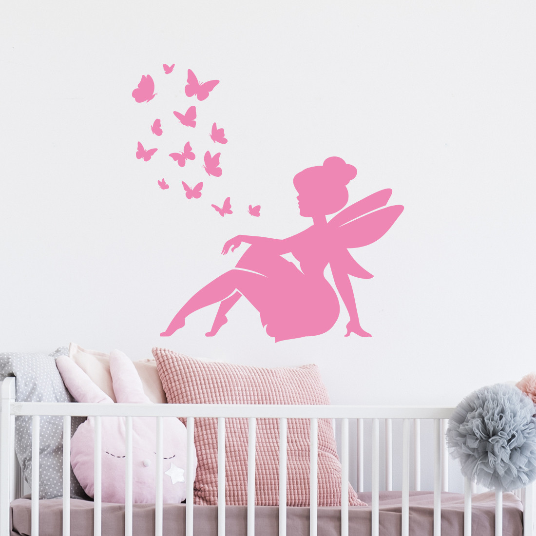 Apportez de la magie et une ambiance féérique à la décoration de la chambre de votre petite fille grâce à ce sticker mural fée et son envolée de papillons.