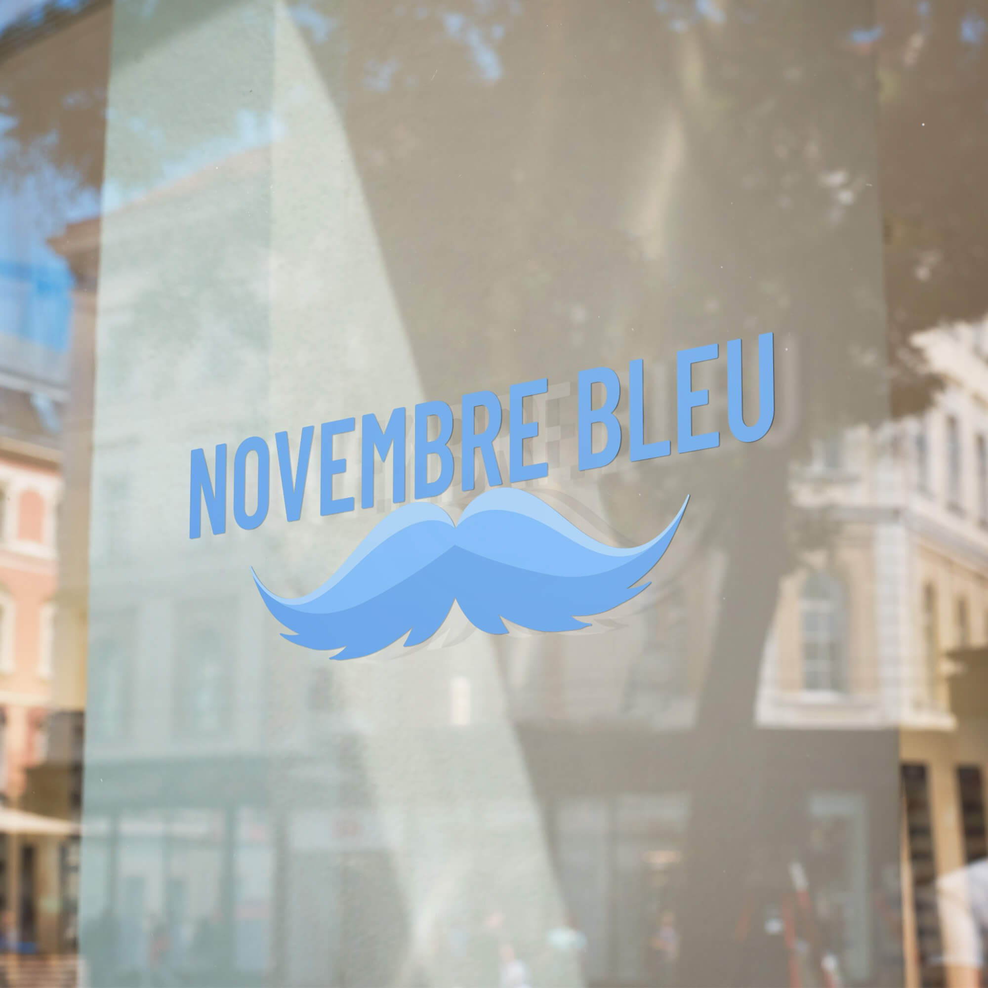 Sticker vitrine Novembre Bleu / Movember livré avec raclette d'application et notice de pose.