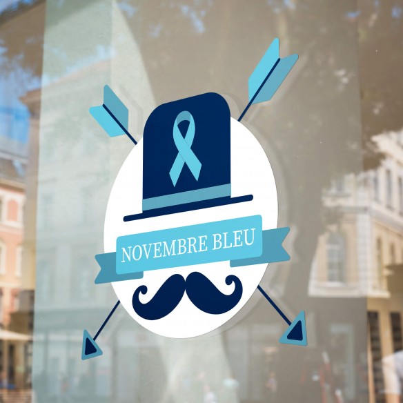 Sticker vitrine Novembre Bleu / Movember livré avec raclette d'application et notice de pose.