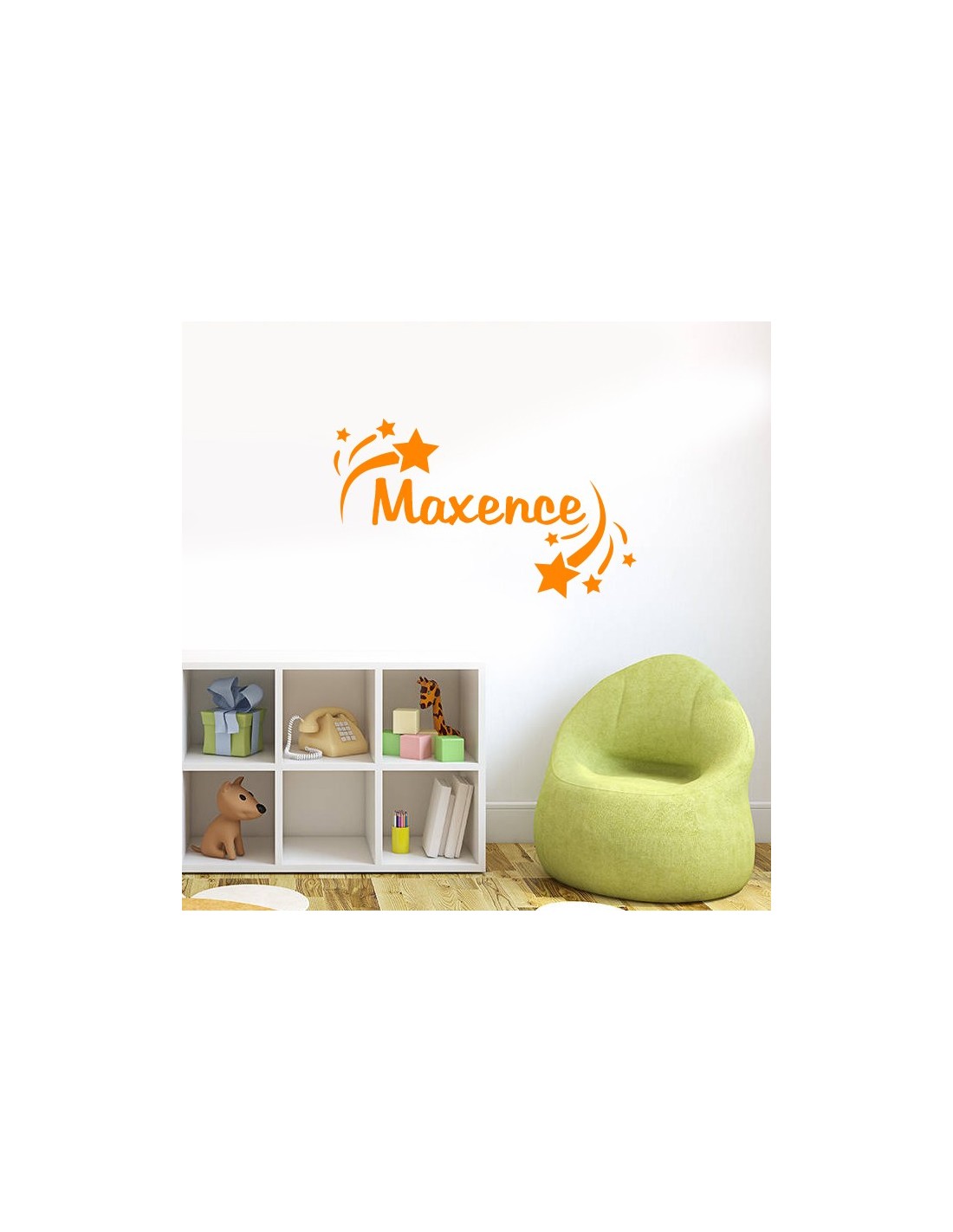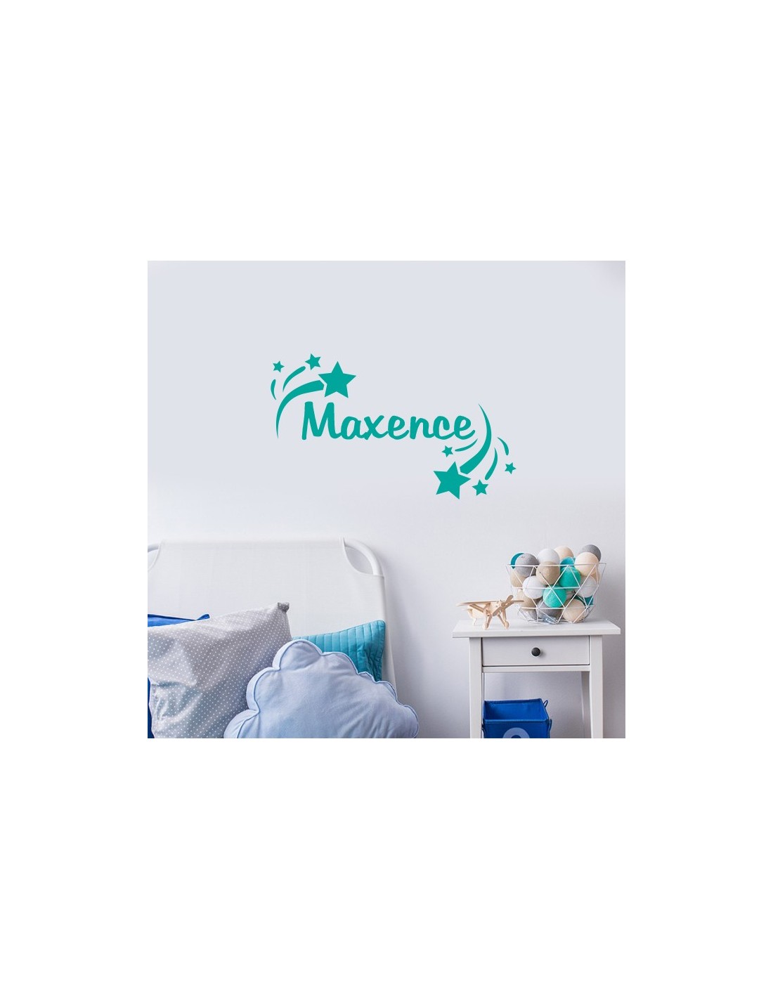 Sticker prénom personnalisé avec ornement d'étoiles filantes. Modèle mixte pouvant aussi bien être fabriqué pour un garçon que pour une fille en personnalisant sa couleur.