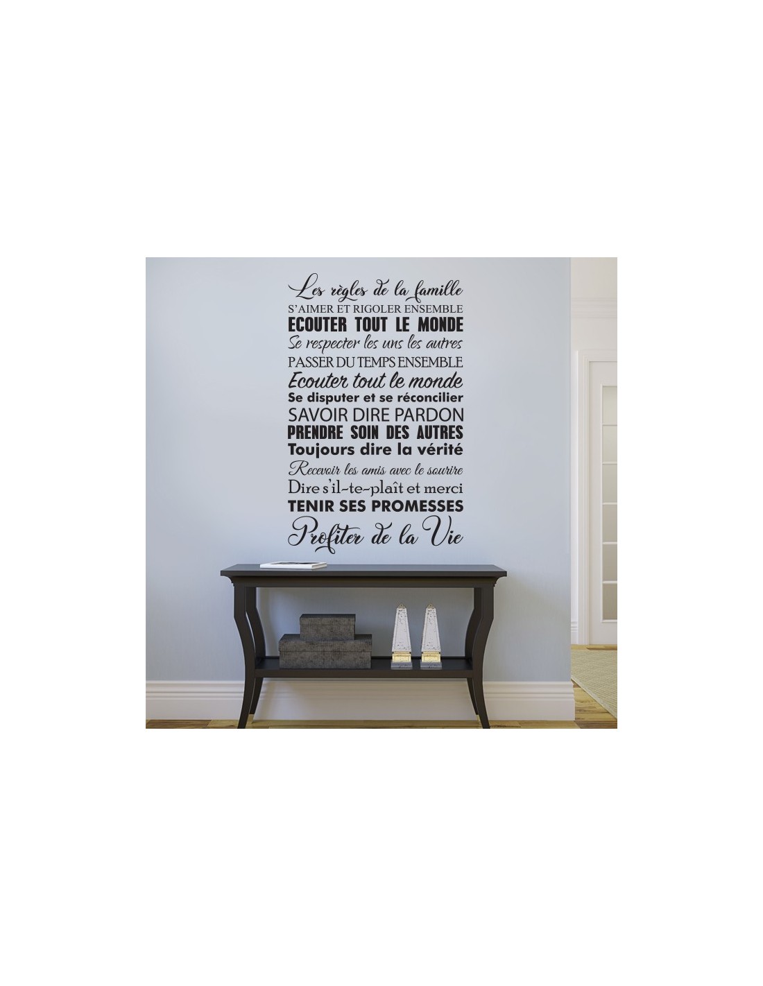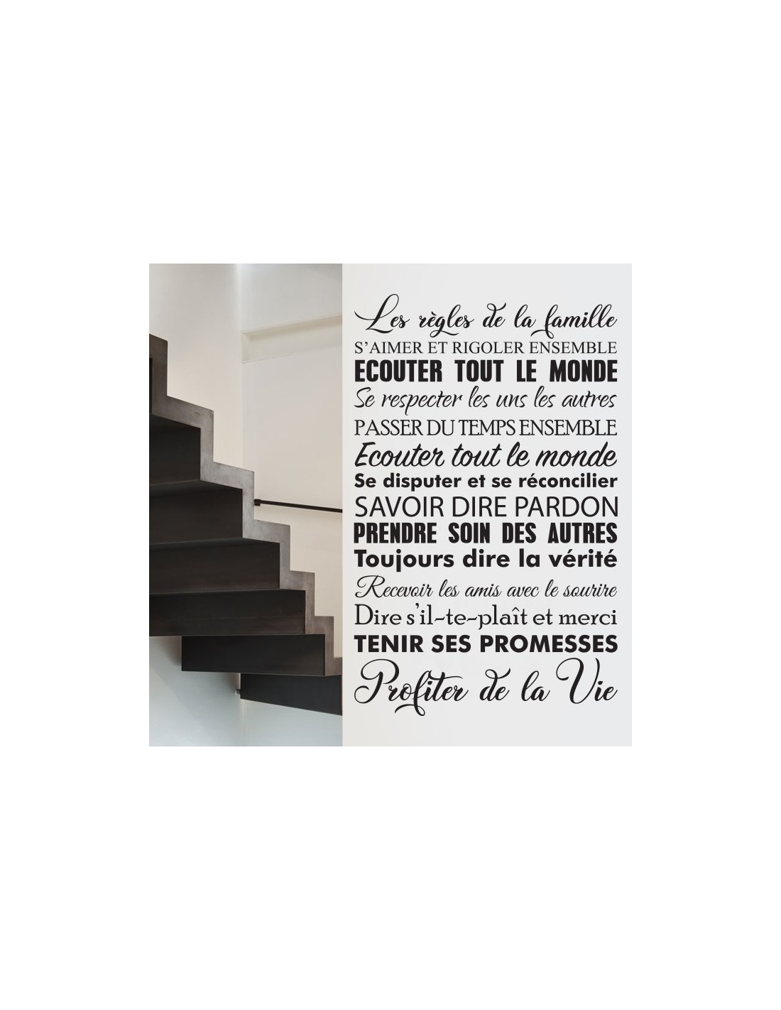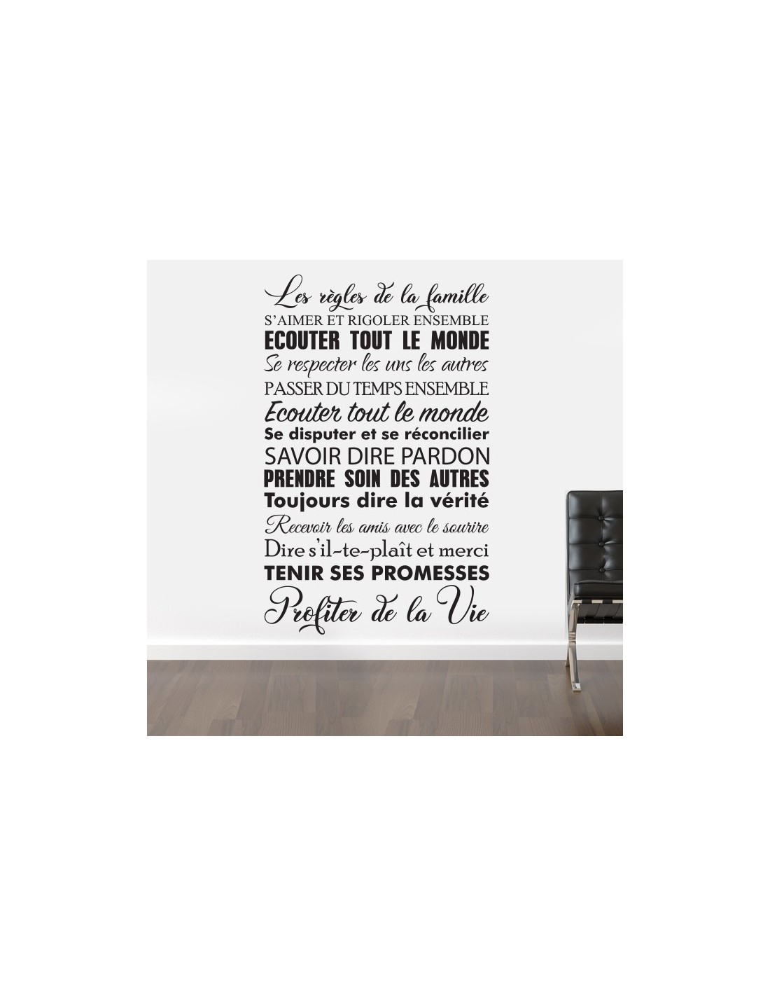 Sticker de décoration avec les règles de la famille pour décorer votre intérieur avec originalité. Ce sticker trouvera facilement sa place dans votre maison pour rappeler les quelques règles fondamentales pour vivre en harmonie dans la joie et la bonne humeur.