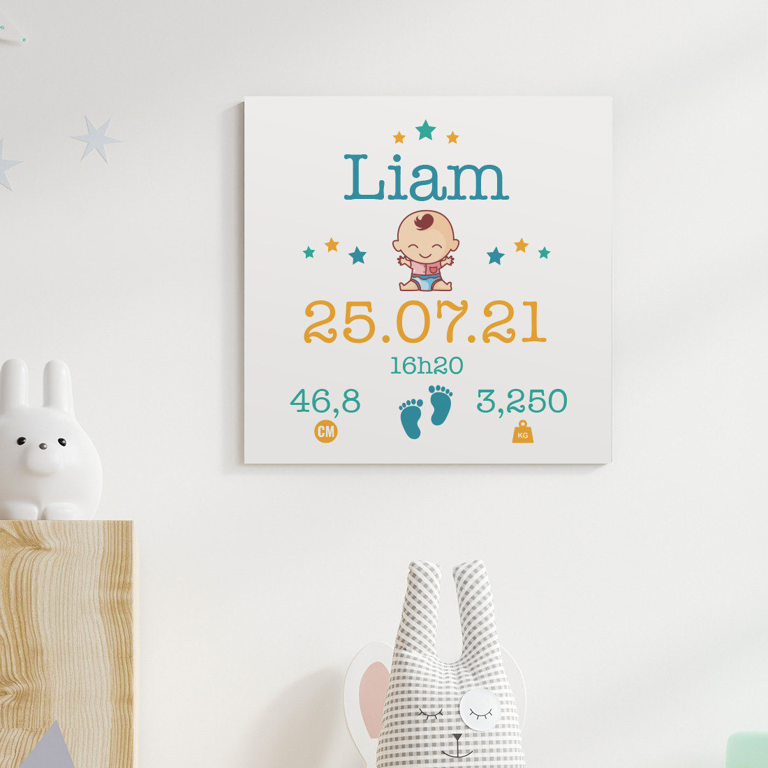 C'est le tableau idéal pour décorer une chambre de bébé ou pour offrir lors d'une naissance ! Un tableau de naissance bébé original et unique à personnaliser avec le prénom de l'enfant, sa date, l'heure ainsi que son poids et sa taille de naissance.