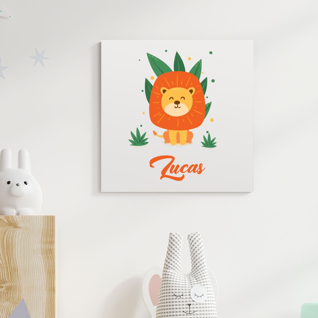 Tableau décoratif pour enfant sur le thème de la jungle. Personnalisez ce tableau lion avec le prénom de l'enfant. Une idée de déco personnalisée et de cadeau original.