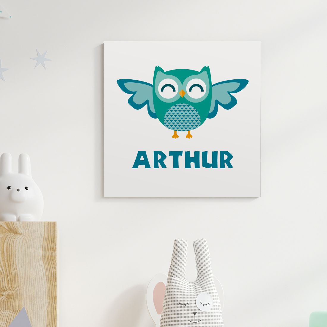 Tableau toile blanche hibou personnalisée avec prénom pour décoration chambre d'enfant ou bébé.