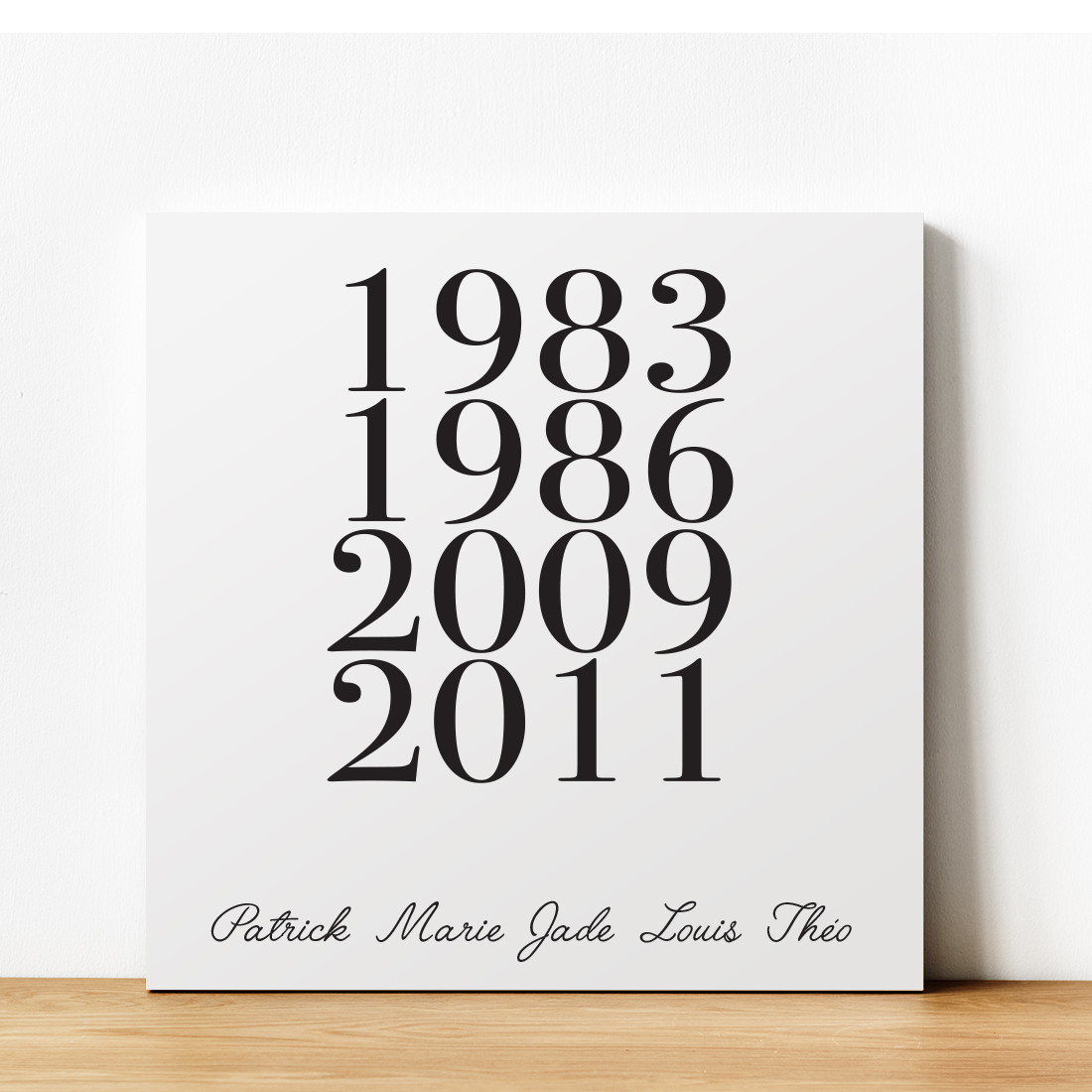 Tableau déco famille avec années et prénoms des membres de votre famille. Une décoration originale et personnalisée qui viendra embellir votre intérieur.
