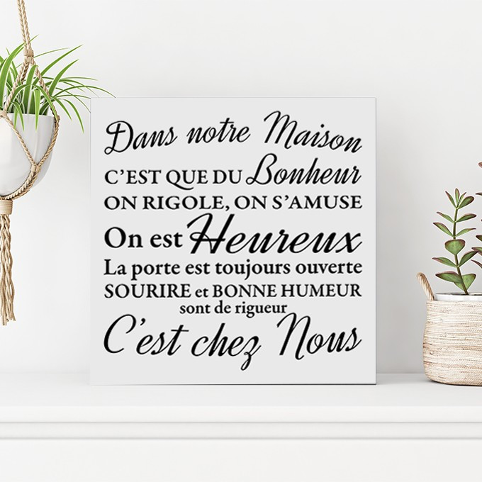 Tableau citation toile blanche canvas "Dans notre maison" et montée sur un châssis en bois. Ce tableau 30x30cm donnera sans aucun doute du cachet à votre décoration d'intérieur.