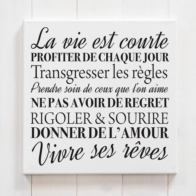Le tableau toile blanche imprimée "La vie est courte" et montée sur un châssis en bois. Ce tableau 30x30cm donnera sans aucun doute du cachet à votre intérieur.