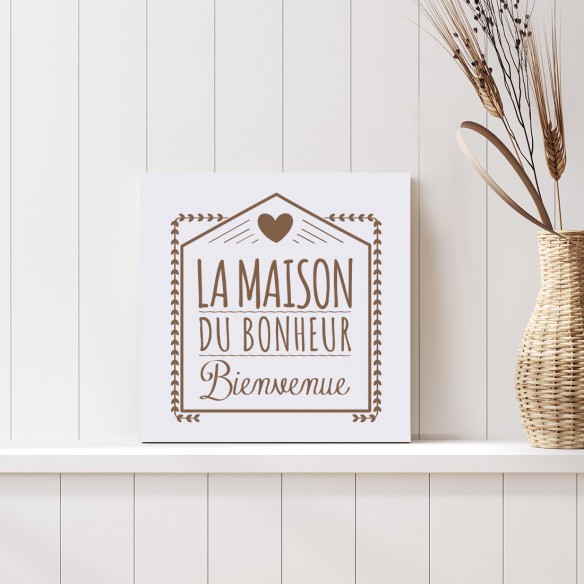 Le tableau citation toile blanche imprimée "la maison du bonheur" et montée sur un châssis en bois. Ce tableau 30x30cm donnera sans aucun doute du cachet à votre intérieur.