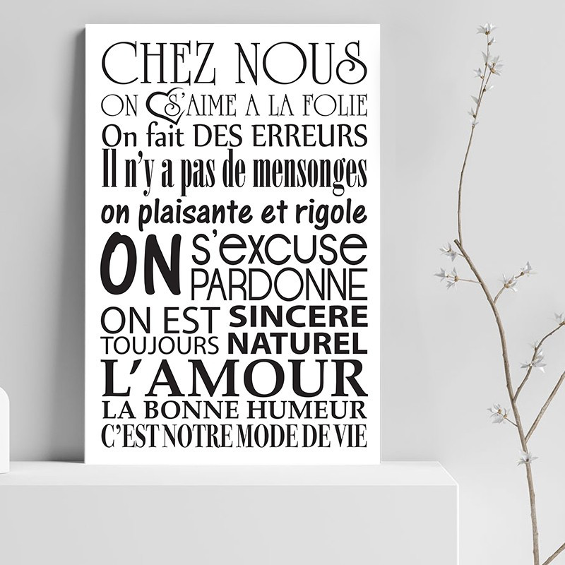 Le tableau toile blanche imprimée "Chez nous" et montée sur un châssis en bois. Ce tableau 30x40cm donnera sans aucun doute du cachet à votre intérieur.