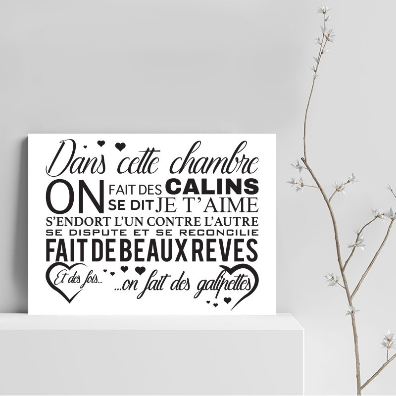 Le tableau citation toile blanche imprimée "Dans cette chambre" et montée sur un châssis en bois. Ce tableau 30x40cm donnera sans aucun doute du cachet à votre intérieur.