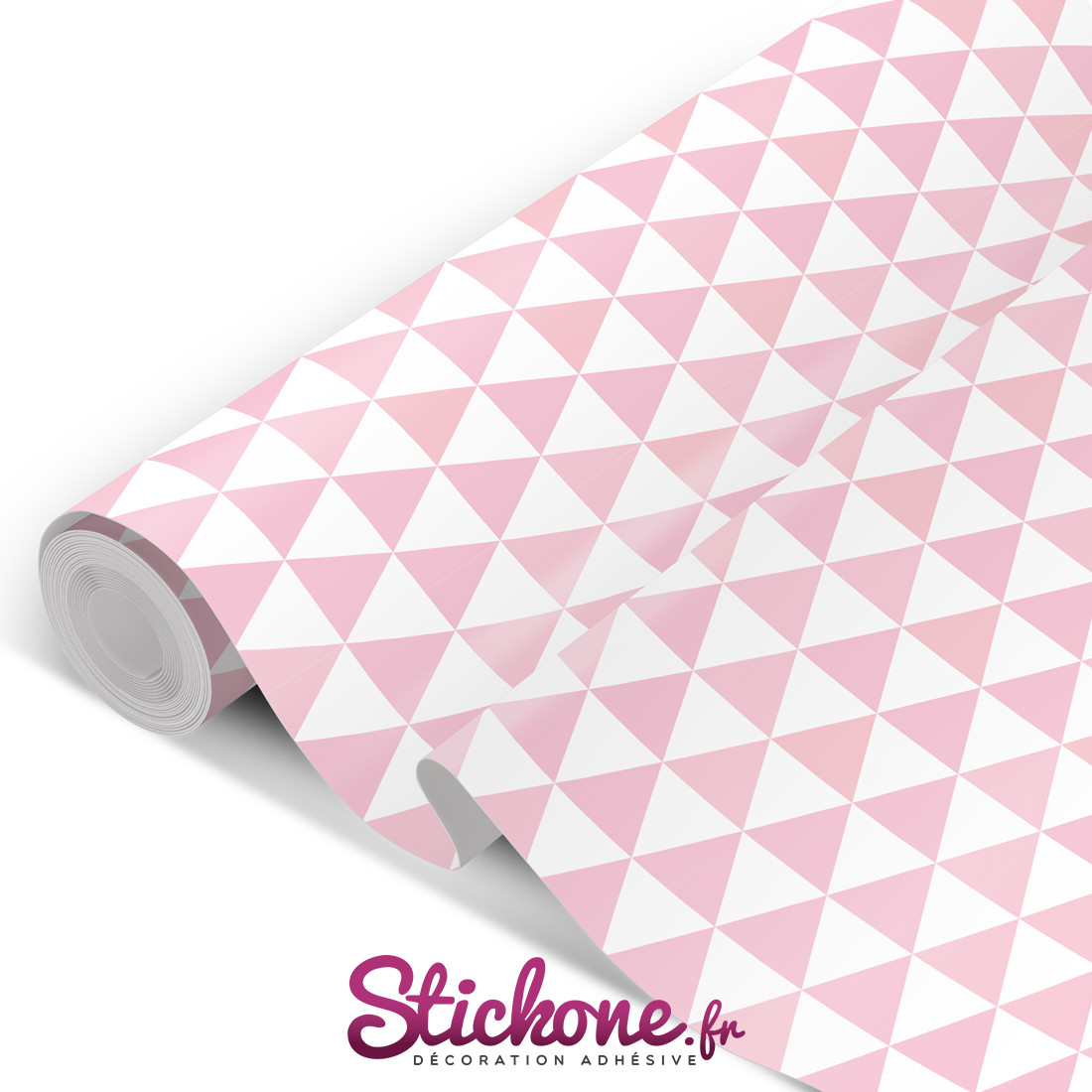 Rouleau de vinyle adhésif créatif triangles rose pour personnalisation de meuble, plateau de bureau, placards, escaliers ou pour vos projets de rénovation, DIY, etc... Film adhésif vendu au mètre linéaire de 1 à 3 mètre. De plus, ce film vinyle peut être découpé au plotter de découpe, silhouette cameo, cricut ou scan n cut.